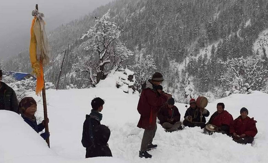 उपल्लो डोल्पामा हिमपात रोक्न हिउँमै बसेर पूजा