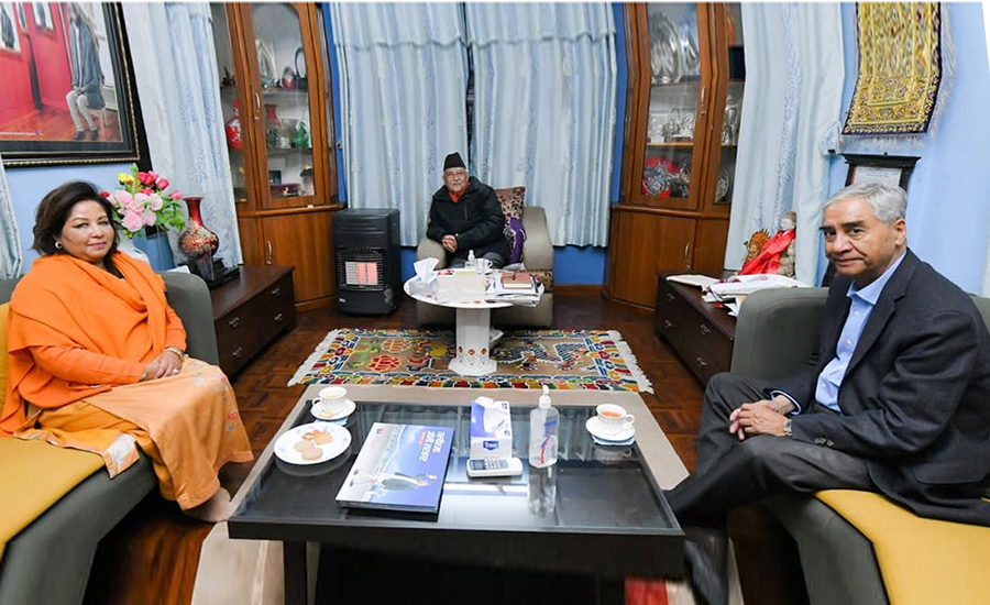 फागुन ५, काठमाडौं - सत्ता गठबन्धनको बैठक सकिएलगत्तै प्रधानमन्त्री शेरबहादुर देउवा नेकपा एमाले अध्यक्ष केपी शर्मा ओलीलाई भेट्न उनको निवास बालकोट पुगेका छन्। बालुवाटारमा बसेको सत्ता गठबन्धनको बैठकमा एमसीसीको विषयमा सहमति जुट्न नसकेपछि प्रधानमन्त्री देउवा पत्नी आरजुसहित बालकोट पुगेका हुन्।