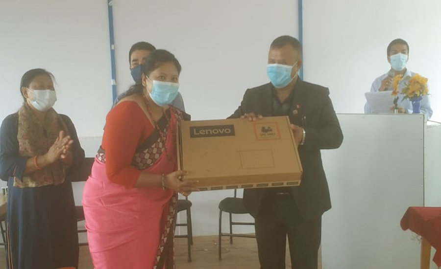 उहाँले हालको समय कोरोना महामारीको त्रासमय वातावरणमा लकडाउनको समय भएको र स्कूलका विद्यार्थी एवं शिक्षक शिक्षिकाबीच अनलाइन कक्षामार्फत कक्षा संचालन भइरहेको अवस्थालाई मध्यनजर राख्दै शिक्षक शिक्षिकालाई अनलाईन कक्षामा सहजता होस् भन्ने हेतुले अत्यावश्यक माध्यम ल्यापटप वितरण गरेको खुलासा गर्नुभयो ।