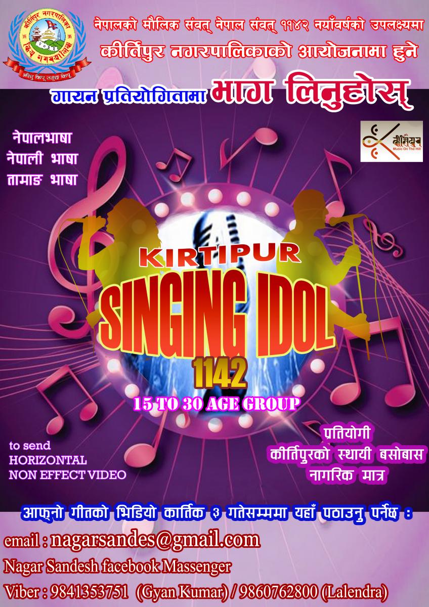 कीर्तिपुर नगरपालिकाको आयोजनामा सांगितिक कार्यक्रम कीर्तिपुर नगरव्यापी गायन प्रतियोगिता ‘कीर्तिपुर सिङ्गिङ आइडल ११४२’ हुने भएको छ ।
