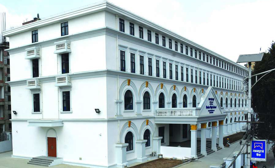 विसं २०७२ मा भूकम्पले पूर्णरूपमा क्षति पु¥याएको उक्त हाइस्कुलको पुनःनिर्माणको शिलान्यास २०७५ साउन १८ गते गरिएको थियो । विसं १९१० मा राणाका छोराछोरी पढाउन तत्कालीन प्रधानमन्त्री जङ्गबहादुर राणाको पालामा सो विद्यालय स्थापना गरिएको थियो । विसं १९६४ मा संस्कृत पढ्नका लागि मात्र सर्वसाधारणका छोराछोरीलाई पनि खुला गरिएको सो विद्यालयमा विसं २०४८ देखि अन्य विषय पनि पढ्न पाउने व्यवस्था गरिएको थियो । विसं २०३० मा राष्ट्रिय शिक्षा पद्दति ऐन लागू भएपछि उक्त विद्यालय जिल्ला शिक्षा कार्यालयमार्फत सञ्चालन हँुदै आएको छ ।