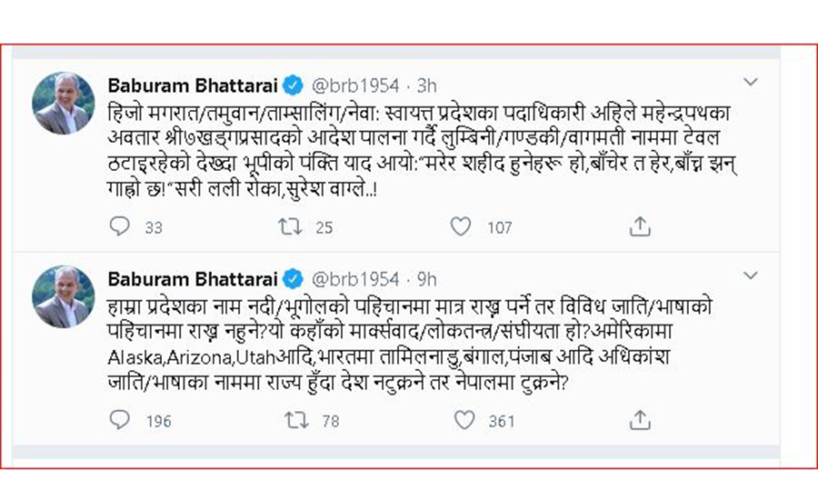 डा. भट्टराईले ट्विटरमा लेखेका छन्, ‘हाम्रा प्रदेशका नाम नदी/भूगोलको पहिचानमा मात्र राख्न पर्ने तर विविध जाति/भाषाको पहिचानमा राख्न नहुने ? यो कहाँको मार्क्सवाद/लोकतन्त्र/संघीयता हो ?’