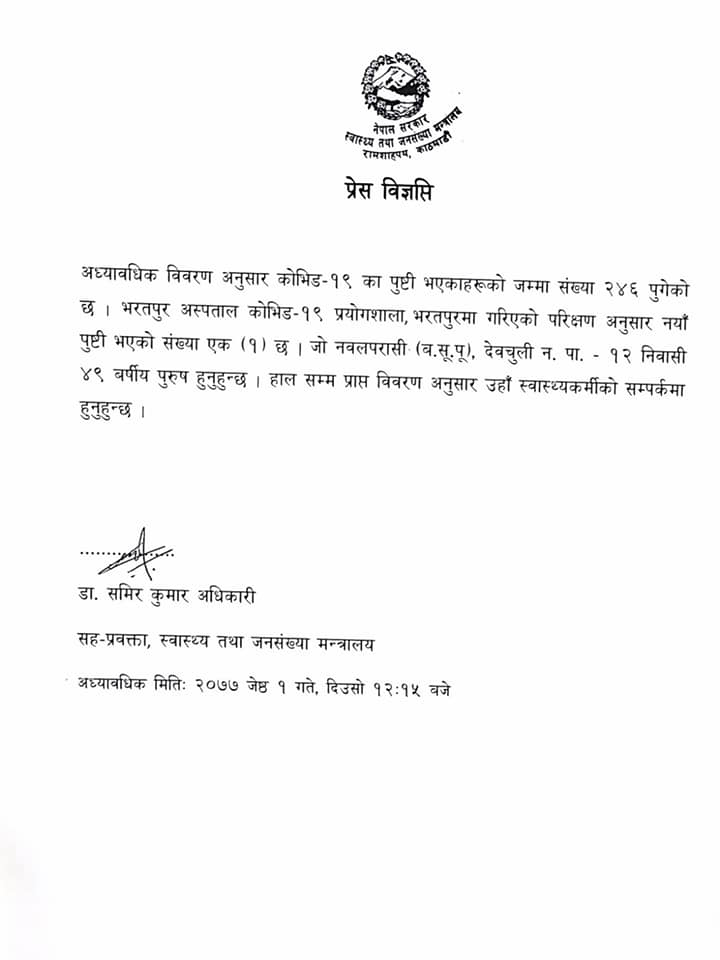 काठमाडौं – स्वास्थ्य तथा जनसंख्या मन्त्रालयका सहप्रवक्ता डा. समिरकुमार अधिकारीले जनाएअनुसार भरतपुर अस्पताल कोभिड–१९ प्रयोगशाला, भरतपुरमा गरिएको परीक्षणमा ४९ वर्षीय पुरुषमा कोरोना पुष्टि भएको छ । योसँगै नेपालमा कोरोना संक्रमितको संख्या २४६ पुगेको छ । नवलपरासी देवचुली १२ का ती व्यक्तिमा संक्रमण देखिएको र उनी अहिले स्वास्थ्यकर्मीको सम्पर्कमा छन् । यसअघि त्रिवि शिक्षण अस्पतालमा भर्ना भएकी ६ वर्षीय बालिकामा कोरोना संक्रमण भेटिएको हो । बालिकाको राष्ट्रिय जनस्वास्थ्य प्रयोगशाला, काठमाडौंमा परीक्षण गरिएको थियो । बालिकालाई अहिले शिक्षण अस्पतालको आइसोलेसनमा राखिएको छ । उनलाई संक्रमण देखिएसँगै उपचारमा संलग्न चिकित्सक क्वारेन्टाइनमा बसेका छन् ।