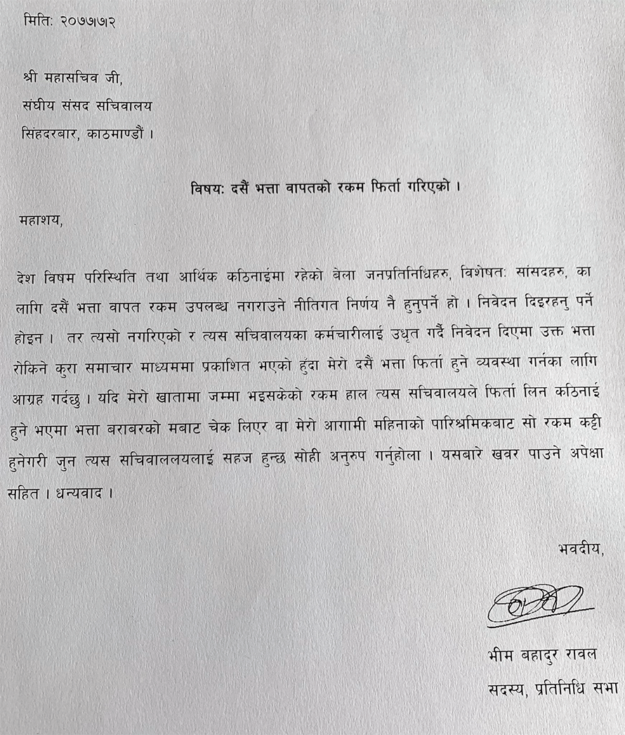 दशैँ भत्ता फिर्ता गर्न सचिवालयलाई सांसदको पत्र