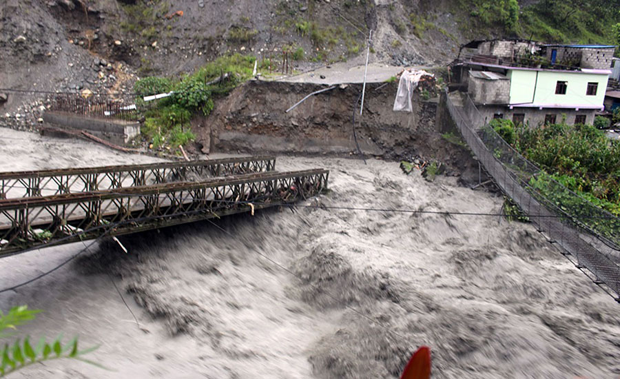 अविरल वर्षासँगै तनहुँको शुक्लागण्डकी नगरपालिकास्थित सेतीमा आएको बाढी । बाढीका कारण शुक्लागण्डकी नगरपालिका–४ र ८ जोडने सेती नदीमाथि निर्माण गरिएको पुल जोखिममा परेको छ ।तस्वीर ः कृष्ण न्यौपाने[/caption] धवलागिरि गाउँपालिका–७ ताकमको रत्नेगैरामा रहेको ताकम माविको पुस्तकालय भवन बाढीले बगाएको स्थानीय गणेश सुवेदीले जानकारी दिनुभयो । ताकम स्वास्थ्य चौकीको पुरानो भवन भत्किएको छ । पाखोको भल पसेर किमचौर फाँटमा भर्खरै रोपिएको धान नष्ट भएको छ । हिलापोखरीमा रेशम फगामीको घर भत्किएको छ । मानवीय क्षति भने भएको छैन । ताकमकै देउबुजामा छ घर पहिराको जोखिममा परेका स्थानीय गोपाल आचार्यले जानकारी दिनुभयो । यसैबीच रघुगङ्गा नदीमा आएको बाढीले राहुघाटको बेलिब्रिज बगाएपछि म्याग्दीको रघुगङ्गा र अन्नपूर्ण गाउँपालिका हँुदै मुस्ताङ जोड्ने बेनी जोमसोम सडक पूर्णरुपमा अवरुद्ध भएको छ । नदीको कटानका कारण बेलिब्रिजको राहुघाटतर्फको जीप भत्काएर बगाएको रघुगङ्गा गाउँपालिकाका अध्यक्ष भवबहादुर भण्डारीले बताउनुभयो । बेलिब्रिज म्याग्दीको बेनी नगरपालिका–९ गलेश्वर र रघुगङ्गा गाउँपालिका–३ राहुघाटको सिमानामा पर्छ । रघुगङ्गा, अन्नपूर्ण गाउँपालिका र मुस्ताङ जिल्ला सिधा यातायात सम्पर्क बिच्छेद भएको छ । रघुगङ्गा–३ मा पर्ने राहुघाटका ३० घर विस्थापित भएका छन् । सो बस्ती कटानको उच्च जोखिममा परेको छ । स्थानीय बासिन्दालाई गलेश्वर र गायत्री मन्दिरमा राखिएको उहाँले जानकारी दिनुभयो । गलेश्वरका स्थानीय दीपक कार्कीले ठेकेदारले पक्की पुल बनाउन ढिलाइ गर्दा बेलिब्रिज कटानको जोखिममा परेर बगाएको बताउनुभयो । बेलिब्रिजको छेउमा पक्की पुल निर्माणका क्रममा छ । पहिरो प्रभावित ठाउँमा सेना, सशस्त्र र नेपाल प्रहरीको टोली उद्धारमा परिचालन गरिएको प्रमुख जिल्ला अधिकारी ज्ञाननाथ ढकालले बताउनुभयो । घाइतेको उद्धार र बेपत्ताको खोजीका लागि हेलिकप्टर पठाउने तयारी भएको छ । वर्षा भइरहेको र बादल लागेको तथा ठाउँठाउँमा पहिराले सडक अवरुद्ध भएकाले सुरक्षाकर्मीलाई घटनास्थलमा पुग्न कठिनाइ भएको प्रहरी नायब उपरीक्षक किरनजंग कुँवरले जानकारी दिनुभयो । प्रहरी टोली घटनास्थल पुगेपछि विस्तृत जानकारी आउने उहाँले बताउनुभयो । बिहीबार रातिदेखिको अविरल वर्षासँगै माथिल्लो क्षेत्रमा पहिरो जाँदा रघुगङ्गा, म्याग्दी र कालीगण्डकी नदीमा बाढीको सतह बढेको छ । तटीय क्षेत्रका बासिन्दालाई सतर्कता अपनाउन अनुरोध गरिएको छ । म्याग्दी नदीले बगाएर ल्याएको दाउरा छोप्ने क्रममा खोलामा पसेका बेनी नगरपालिका–४ सिञ्गा तातोपानीका दुई जनालाई उद्धार गरिएको छ । मङ्गला–३ का २४ वर्षीय दलबहादुर घर्ती (मिलन) र ४८ वर्षीय सूर्य थापा द