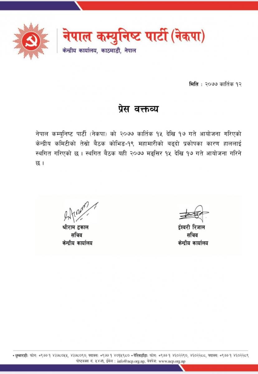 नेकपा पार्टी कार्यालयका सचिवद्वय श्रीराम ढकाल र इश्वरी रिजालले विज्ञप्ति जारी गर्दै बैठक स्थगित भएको जनाएका छन्।