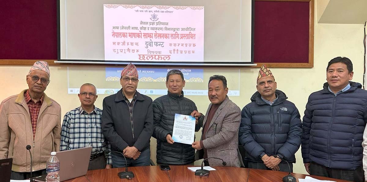 काठमाडौं - नेपालमा बोलिने १२५ भाषाका लागि साझा लेखन पद्धति विकास गर्ने उद्देश्यले एउटै ‘फन्ट’ निर्माण गरिएको छ । नेपाल प्रज्ञा प्रतिष्ठाले गठन गरेको नेपालका भाषाको साझा लेखन पद्धतिको विकास अध्ययन कार्यदल र आवरण प्रकाशनबीचको सहमतिअनुसार फन्ट निर्माण गरिएको हो ।