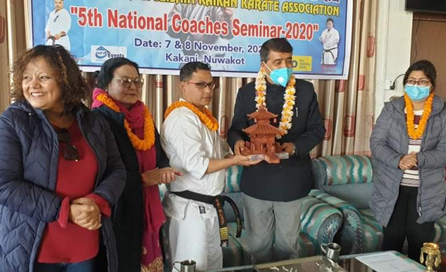 नेपाल क्योकुशिन सेईसिन काईकान कराँते संघको बार्षिक कार्यक्रम अनुसार ककनि अन्तराष्ट्रिय ट्रेनिङ्ग सेण्टर, नुवाकोटमा कार्तिक २२र २३ गते गरी २ दुई दिने “पाँचौ राष्ट्रिय फुलकन्ट्याक्ट कराँते कोच सेमिनार–२०२०” हालै सम्पन्न भएको छ । राष्ट्रिय खेलकुद परिषदको सदस्य सचिव रमेश कुमार सिलवालले प्रमुख आतिथ्यको रुपमा पानसमा दिप प्रज्वलन गरी कार्यक्रमको समुदघाटन गर्नु भएको थियो । उहाँले मन्तव्यको क्रममा अहिले विश्वब्यापी रुपमा फैलिरहेको कोभिड–१९ ले समग्र खेलकुद क्षेत्रलाई नै प्रभावित गरिरहेको छ र यो विषम परिस्थितिको समय संग उच्च मनोबलका साथ लडने र सजगताका साथ दैनिक खेलकुद गतिविधिलाई संचालन गर्नुपर्नेमा जोड दिनुभयो ।