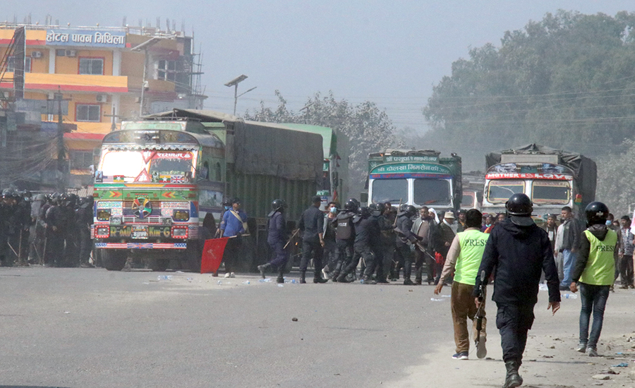 प्रहरी र बन्दकर्ताबीच बर्दिबास सडकमा झडप, प्रहरीले बल प्रयोग गरी सडक खाेले