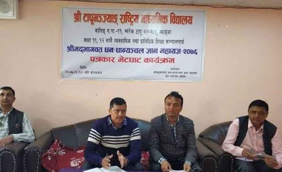 जनमार्ग माध्यमिक विद्यालय पूर्वखोला गाउँपालिका–१ सिलुवा पाल्पामा प्राविधिक शिक्षा सञ्चालन गर्न श्रीमद्भागवत धनधान्याञ्चल विराट नवाह ज्ञानमहायज्ञ आजबाट शुरु हुँदैछ । महायज्ञमा पण्डित नारायण न्यौपानेबाट सङ्गीतमय शैलीमा कथावाचन हुनेछ । महायज्ञ यही वैशाख ३१ गतेसम्म हुनेछ ।