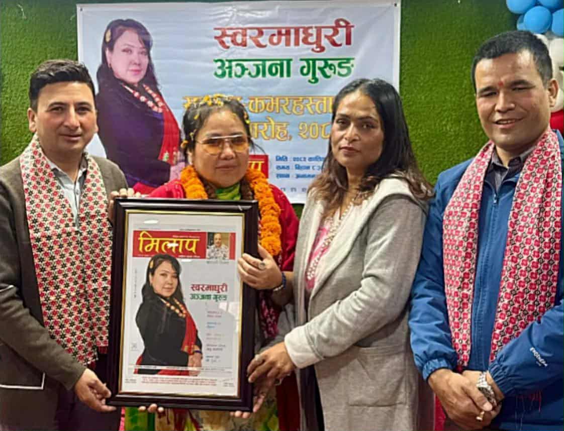 नेपालको गीतसंगीत क्षेत्रका वरिष्ठ गायिका अञ्जना गुरुङलाई ‘स्वरमाधुरी’ मिलाप सम्मान अर्पण गरिएको छ । बुधबार अनामनगर स्थित डालो रेष्टुरेन्टमा सम्पन्न एक विशेष समारोहबीच उहाँलाई मिलाप मासिकको कात्तिक अङ्कको अावरण अंकित सम्मान अर्पण गरिएको हो । मिलाप मासिकका सम्पादक कृष्ण भुसालको सभापतित्वमा भएको सो कार्यक्रममा प्रमुख अतिथि महाकाव्यकार खेमनाथ दाहाल, विशेष अतिथि अन्तर्राष्ट्रिय नेपाली साहित्य समाजका पूर्व अध्यक्ष एवं साहित्यिक पत्रकार संघका अध्यक्ष राधेश्याम लेकाली, कीर्तिमानी संगीतकार सन्तोष श्रेष्ठ, वरिष्ठ गायक तथा संगीतकार कन्हैया सिंह, अग्रज पत्रकार सानु श्रेष्ठ, टिका गोपाल एम क्रियशन अध्यक्ष गीता सिंह, पत्रकार किशन अर्याल, अनुप सिंह लगायतको आतिथ्यतामा उक्त सम्मान अर्पण गरिएको थियो । कार्यक्रमको सहजिकरण निर्देशक माधव खरेलले गर्नु भएको थियो ।