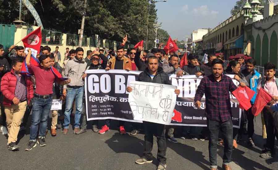 नेविसङ्घले भारत सरकारले भर्खरै जारी गरेको नक्सामा नेपाली भू–भाग कालापानी र लिपुलेकलाई भारतको नक्सामा समावेश गरेको भन्दै विरोध गरेको हो । नेविसङ्घले आज त्रिचन्द्र क्याम्पस अगाडि विरोध प्रदर्शन गरेको छ ।
