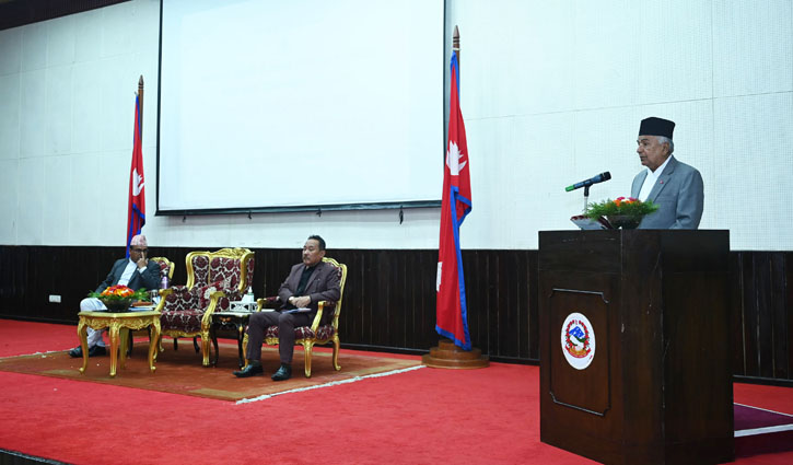 काठमाडौँ, राष्ट्रपति रामचन्द्र पौडेलले नेपाली भाषा, साहित्यको विकासमा राष्ट्रकवि माधवप्रसाद घिमिरेको योगदान अतुलनीय रहेको बताउनुभएको छ । राष्ट्रकवि माधवप्रसाद घिमिरेको एक सय ५औँ जन्मजयन्तीमा मस्र्याङ्दी वाङ्मय प्रतिष्ठानद्वारा आज राष्ट्रपति भवन शीतल निवासमा आयोजित पुरस्कार वितरण समारोहलाई सम्बोधन गर्दै राष्ट्रपति पौडेलले राष्ट्रकवि घिमिरेको योगदानको चर्चा गर्नुभएको हो । “राष्ट्रकवि घिमिरेका साहित्यिक सृजना हाम्रै पाखा पखेराका नेपाली जनजीवनका भोगाई, प्रकृति, संस्कृति र मानवीय संवेदनामात्र नभई राष्ट्रिय भावनाले ओतप्रोत भएको पाइन्छ, यसले भाषा, साहित्य मात्र नभएर समग्र वाङ्मयको क्षेत्रलाई समृद्ध बनाउन र हाम्रो राष्ट्रिय स्वाभिमानको भावना अभिवृद्धि गर्न योगदान दिएको छ”, राष्ट्रपति पौडेलले भन्नुभयो । कला, भाषा, साहित्य र संस्कृति सभ्य तथा सुसंस्कृत समाजको परिचायक भएको धारणा उहाँले व्यक्त गर्नुभयो । “यसैका माध्यमबाट एउटा समृद्ध समाज निर्माण मात्र होइन आपसमा भाइचारा, मेलमिलाप र राष्ट्रिय एकताको भावना जागृत गरी यसलाई सुदृढ र सबल बनाउन योगदान पुग्दछ भन्ने मलाई लाग्दछ, त्यसैले, राज्यले मात्र होइन जनस्तर र वाङमयप्रेमीले स्रस्टाको सम्मानमा कन्जुस्याँइ गर्न हुँदैन,” उहाँले भन्नुभयो । भाषिक तथा सांस्कृतिक बहुलता एवम् भौगोलिक विविधताले युक्त हाम्रो देशको गौरव, पहिचान भनेकै हाम्रा भाषा, साहित्य, संस्कृति भएको उहाँले बताउनुभयो । “यिनको संरक्षण, सम्वर्द्धन र विकास गर्नु हामी सबैको कर्तव्य हो”, राष्ट्रपति पौडेलले भन्नुभयो । मस्र्याङ्दी वाङ्मय प्रतिष्ठानले लमजुङको भाषा, कला, साहित्य, संस्कृति, शिक्षासहित मुलुकको वाङ्मयकै विकासका लागि देखाएको क्रियाशीलता र जागरुकता अनुकरणीय भएको उहाँको भनाइ थियो । राष्ट्रकविको जन्मजिल्ला लमजुङमा उहाँको प्रतिमा बनाएर राष्ट्रकविको विहङ्गम व्यक्तित्व र कृतित्वलाई चिरस्थायी बनाउन भइरहेको प्रयासले छिट्टै सार्थकता पाउने उहाँले विश्वास व्यक्त गर्नुभयो । सो अवसरमा राष्ट्रपति पौडेलले यस वर्षको राष्ट्रकवि माधवप्रसाद घिमिरे पुरस्कार वरिष्ठ गीतकार किरण खरेललाई प्रदान गर्नुभयो । सो पुरस्कारको राशि रु एक लाख नगदसहित सम्मानपत्र रहेको छ । ---