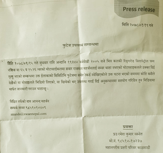 दुर्घटनाको फुटेज उपलब्ध गराउनको निम्ति महानगरीय प्रहरी परिसर काठमाडौंका प्रहरी उपरीक्षक रमेशकुमार बस्नेतले एक प्रेस विज्ञप्तिमा आफ्नो मोबाइल नम्बर ९८५१०–१७२३७ समेत सार्वजनिक गर्दै पीडित पक्षबाट मोटरसाइकल दुर्घटनामा परी मृत्यु भएका मृतक राजमान महर्जनका आफन्त आनन्द महर्जनको नाम एवं मोबाइल नम्बर ९८५१०–१०४०९/९८०२००९२७२ का साथ इमेल Email: ananda@escannepal.com पनि सार्वजनिक गरेका छन् ।