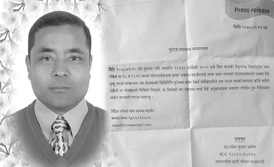 प्रहरी उपरीक्षक बस्नेतले एक प्रेस वक्तव्य जारी गर्दै फुटेज उपलब्धका लागि आह्वान गरेका हुन् । सार्वजनिक भएको प्रेस विज्ञप्तिमा उल्लेख गरिएको छ, ‘मिति २०७८ बैशाख १५ गते बुधबार राती करिब ७ः०० बजेदेखि ८ः०५ बजे समयभित्र कलंकी रिङरोड सीता पेट्रोल पम्प नजिक बा६५प १५२६ नम्बरको मोटरसाइकलमा सवार राजमान महर्जनलाई नम्बर नखुलेका मोटरसाइकलबाट ठक्कर दिई ज्यान गएको सम्बन्धमा उक्त इलाकाको सीसीटिभी फुटेजमा समेत रेकर्ड नदेखिएकोले उक्त घटना भएको समय कोही कसैले देखेको वा मोबाइलबाट भिडियो कैद गरेको वा खिचेको भए उपलब्ध गराई अनुसन्धानमा सहयोग गर्न मिडियामार्फत जानकारी गराउन चाहन्छु ।’