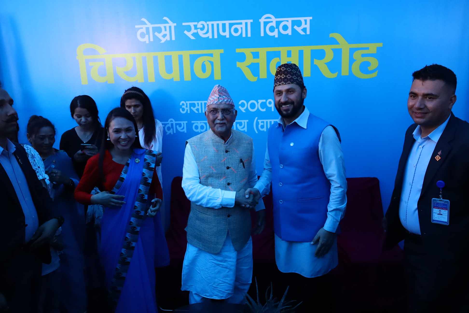 रास्वपाको चियापान समारोहमा गाँजा, बाँस र केराबाट उत्पादित वस्तु प्रदर्शनीमा राखिएको थियो । उक्त वस्तुको अवलोकन गरे मात्र नेताहरू घण्टीघरबाट बाहिरिने व्यवस्था मिलाइएको थियो । ओलीले नेपाली उत्पादनका विभिन्न स्टलहरुको चासोपूर्वक अवलोकन गरे । त्यसक्रममा ओलीलाई गाँजा, अल्लो लगायतबाट बनाइएका कपडा उपहार दिइएको थियो । त्यस्तै नेपाली उत्पादन च्याउ समेत ओलीलाई उपहार दिइएको थियो । त्यस्तै अध्यक्ष ओलीले केहीबेर स्टलमा राखिएको कपडा बुन्ने तान चलाएका थिए ।