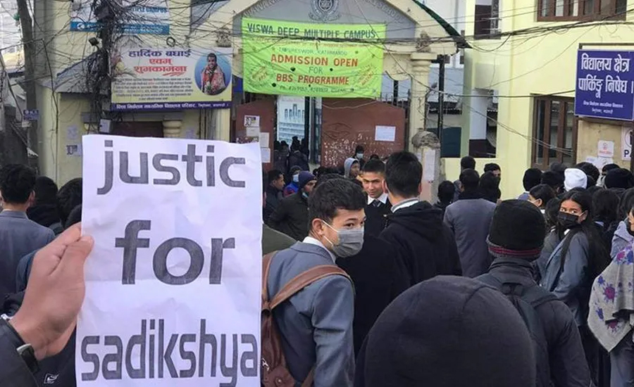 काठमाडौं - त्रिपुरेश्वरस्थित विश्व निकेतन माविमा कक्षा ११ मा अध्ययनरत व्यवस्थापन संकायकी छात्राले आत्महत्या गरेको भन्दै विद्यार्थीले प्रदर्शन गरेका छन् । सानेपा निवासी सप्तरीकी सदीक्षा चौधरी बुधबारराति मृत भेटिएकी थिइन् । अनुशासन प्रमुखको मानसिक यातनाका कारण उनले आत्महत्या गरेको भन्दै विद्यार्थीले न्यायको माग गरेका छन् ।