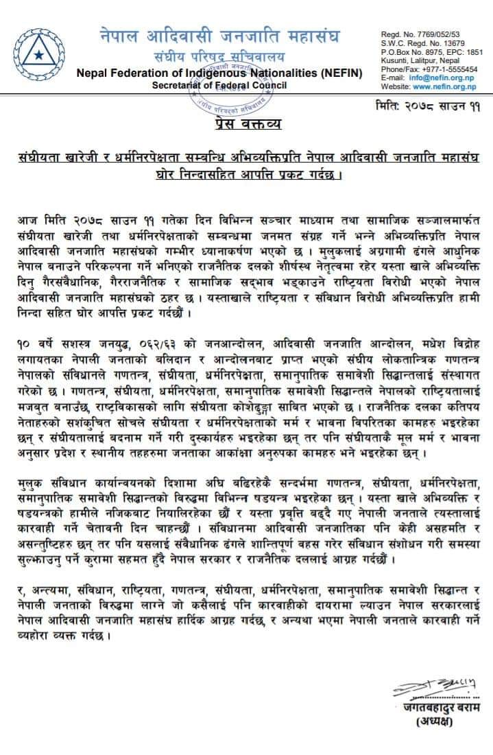 संघीयता खारेजी र धर्मनिरपेक्षता सम्बन्धी अभिव्यक्तिप्रति आदिवासी जनजाति महासंघ घोर निन्दा