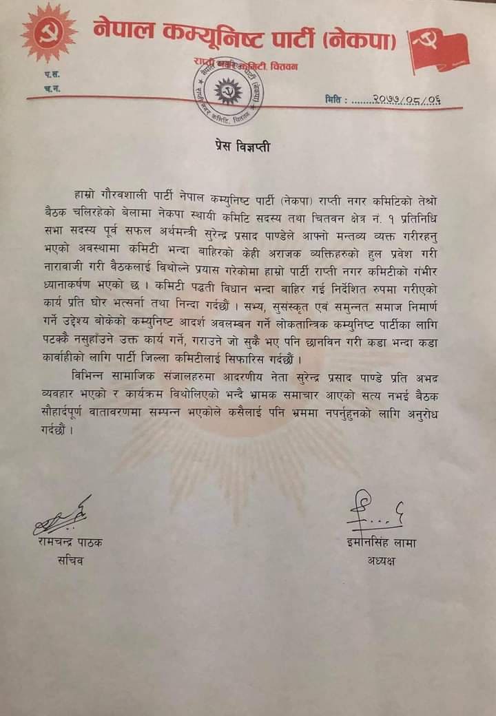 ‘गृह जिल्लाका विकास आयोजनाहरूको अनुगमन तथा पार्टीका कार्यक्रमहरूमा सहभागी हुने क्रममा चितवनमा रहनुभएका हाम्रो पार्टीका स्थायी कमिटी सदस्य, पूर्व अर्थमन्त्री तथा प्रतिनिधिसभा सदस्य कमरेड सुरेन्द्र पाण्डे आज राप्ती नगर पार्टीको बैठकमा सहभागी भई मन्तव्य राखिरहेको बेला अनाधिकृत रूपमा प्रवेश गरेका केही ब्यक्तिहरूले सुनियोजित रूपमा गरेको अभद्र व्यवहार तथा नाराबाजीको निन्दा एवम् भर्त्सना गर्दछु’ नेता नेपालले विज्ञप्तिमा भनेका छन्, ‘सभ्य, सुसंस्कृत एवम् समुन्नत समाज निर्माण गर्ने उद्देश्य बोकेको कम्युनिष्ट आदर्श अवलम्बन गर्ने लोकतान्त्रिक कम्युनिष्ट पार्टीका लागि पटक्कै नसुहाउने उक्त कार्य गर्ने र गराउने जोसुकै भए पनि छानबिन गरी कडाभन्दा कडा कारबाही गर्न स्थानीय पार्टी एवम् सम्बन्धित सबैको गंभीर ध्यानाकर्षण गराउँछु ।’