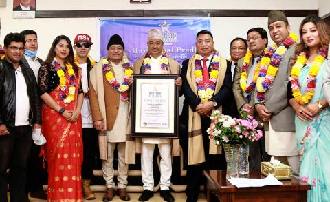 काठमाडौं – वरिष्ठ गीतकार हरि गोपाल प्रधानले आफ्नो गीत ‘यो मुटुमा सधैंभरि’काे म्युजिक भिडियाे हवाइजहाजभित्र विमोचन गरी विश्व कीर्तिमान राख्न सफल भएका छन् । ३६ हजार फिटको उचाइमा हवाइजहाजभित्र एल्बम विमोचन गरी ‘वल्र्ड बुक अफ रकेर्डस्’मा प्रधानले विश्व कीर्तिमान राखेका हुन् । काठमाडौंदेखि नयाँ दिल्लीका लागि उडेको नेपाल वायुसेवा निगमको जहाजभित्र ३६ हजार फिटको उचाइमा सहरी विकास राज्यमन्त्री रामवीर...